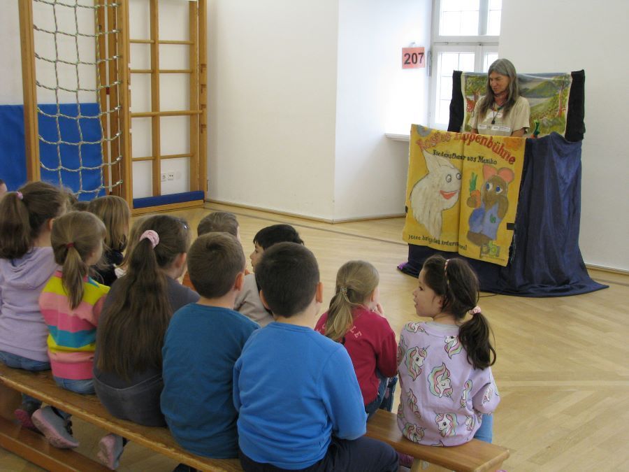 Am Montag, den 11. November 2024, folgten die Erst- und Zweitklässler:innen sehr aufmerksam einem mexikanischen Friedenspuppenspiel.