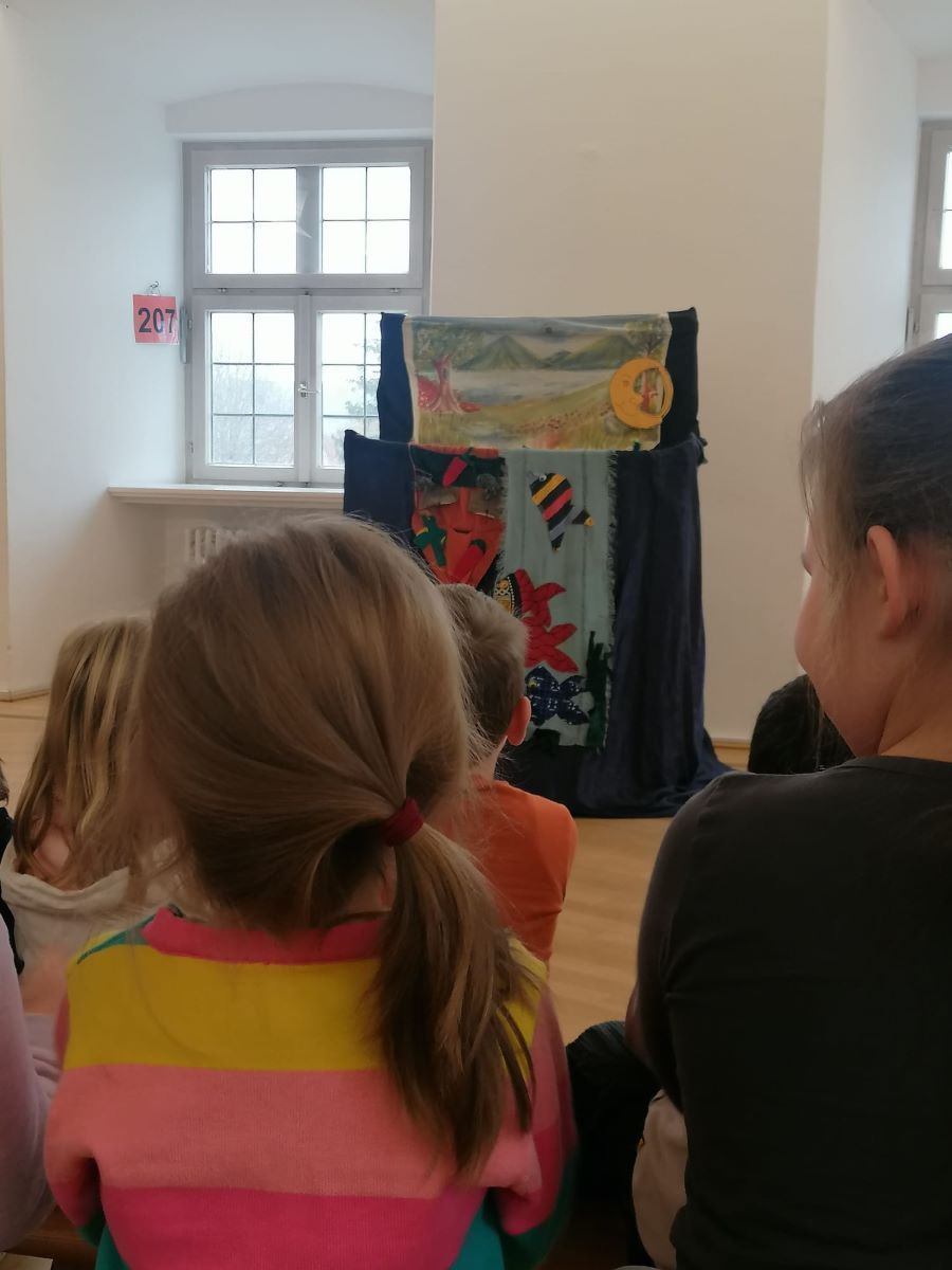 Im zweiten Stück für die Zweitklässler:innen ging es um einen Streit zwischen zwei Hasen und was passieren kann, wenn man jemanden falsch verdächtigt und anderen weh tut. Die Kinder verlangten nach einer Lösung: Es ging gut aus, weil sich die Hasen wieder versöhnt haben und bereit waren zu teilen. So wurde am Schluss zusammen mit der Maus ein Karottenfest gefeiert.