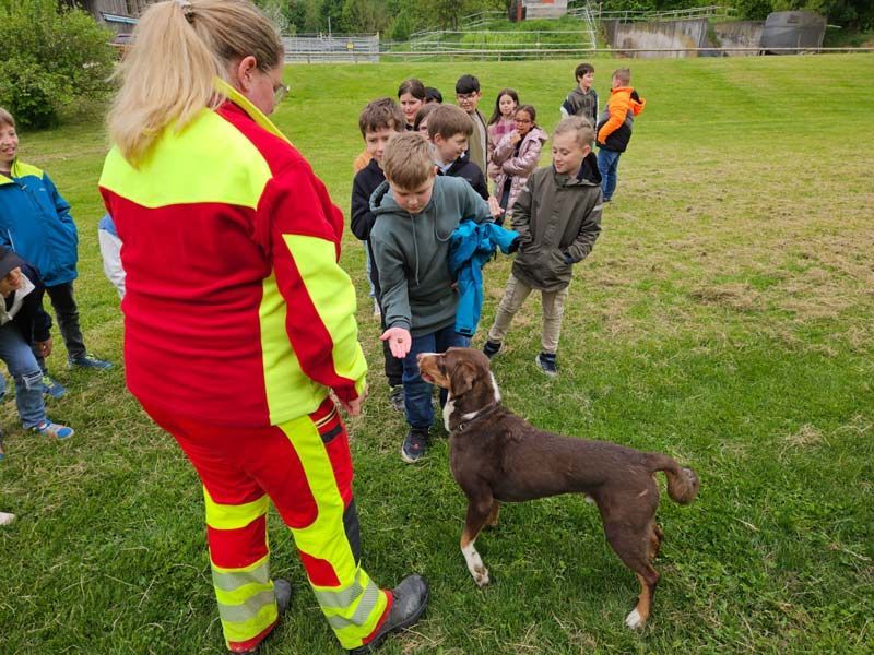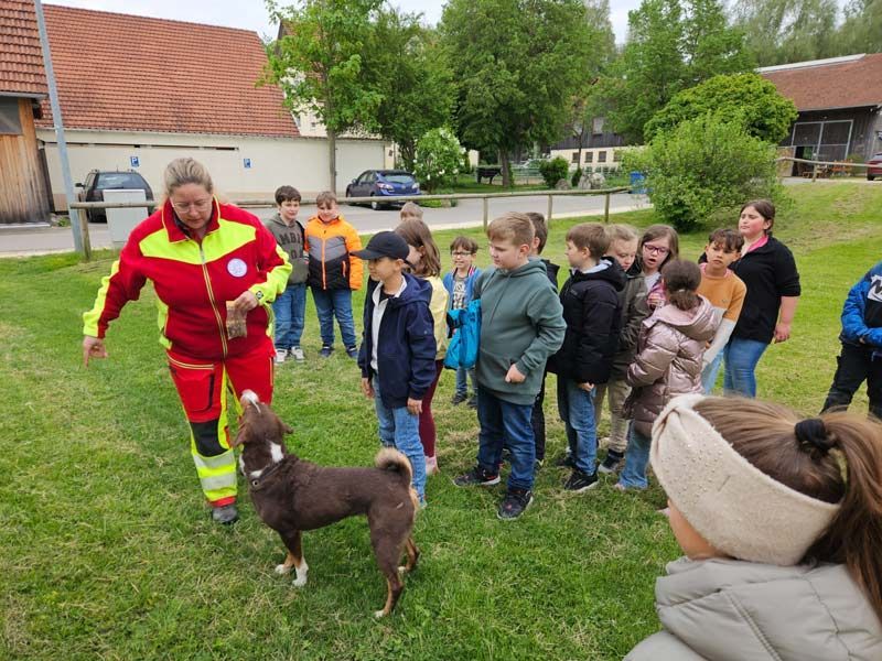 Am Donnerstag, den 8. Mai 2025, besuchte die Rettungshundestaffel Ostwürttemberg die Schloss-Schule. Die Kinder der Klassen 3a und 3b haben sich auf dem Schulhof getroffen. Ein Hundeführer und zwei Hundeführerinnen haben uns viel über die Rettungshunde erzählt. Die Hunde müssen eine lange Ausbildung machen. Frau Müller, Frau Niedermayer und Herr Niedermayer haben uns dann die Hündin Lucy vorgestellt. Sie ist schon 11 Jahre alt. Schüler haben sich auf dem Gelände versteckt. Lucy hat sie schnell wieder gefunden. Es war sehr spannend!