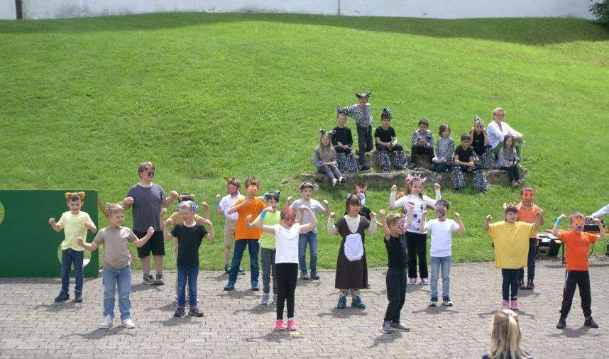 Eröffnet wurde das Fest von den Erstklässlern, die mit den Bewegungsliedern „Matze, die Katze“ und „Sport hält alle Tiere fit“ für tolle Stimmung im Publikum sorgten. Unser Schulleiter Andreas Neidlinger gab anschließend den Start für ein buntes Treiben rund um das Schloss.