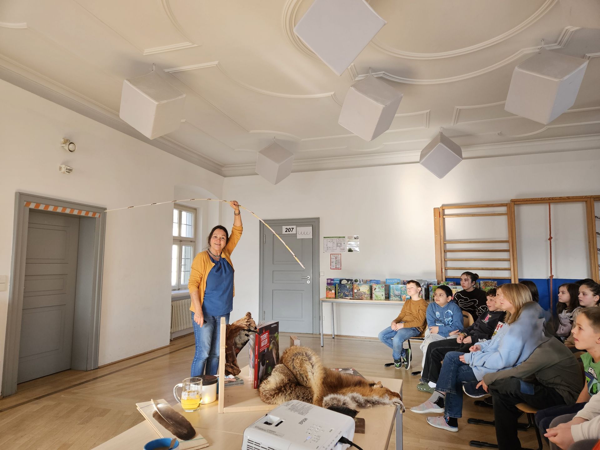Kurze Zeit später erzählte sie von einem Seeadler. Er hatte einen Hecht gefangen mit seinen scharfen Krallen. Frau Oftring zeigte uns mit einem Meterstab wie lang die Flügel und der Körper des Seeadlers sind. Die Flügelspannweite beträgt 2,5 Meter.