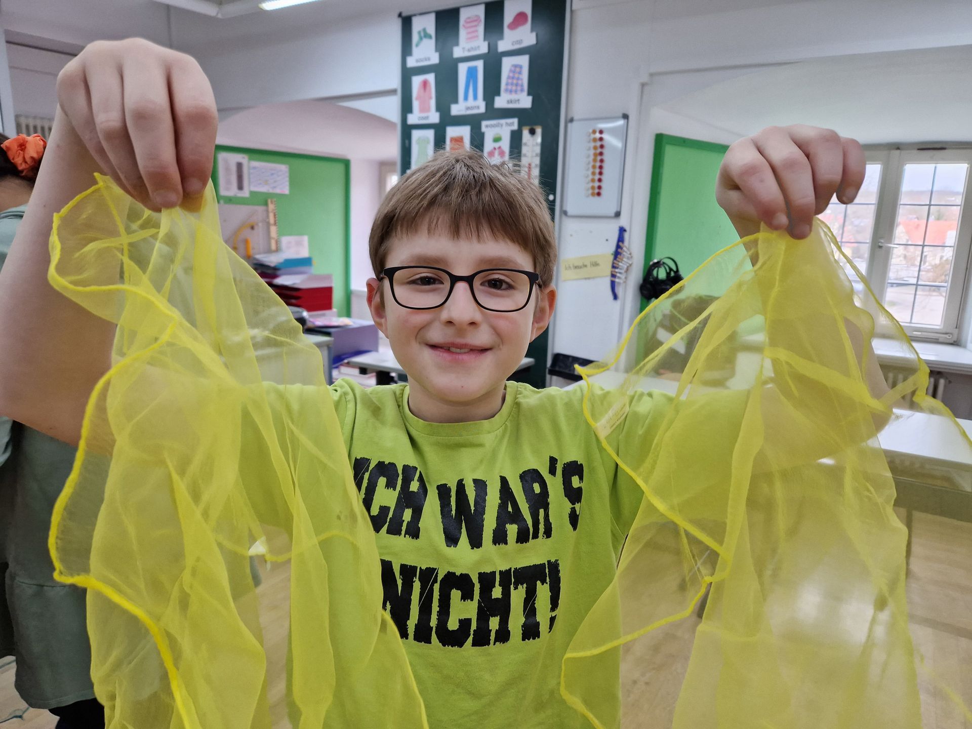 Aber warum jonglieren wir eigentlich in der Schule? Es gibt eine Menge guter Gründe! Zunächst ist da natürlich die Koordinationsfähigkeit. Jonglieren ist Jogging für das Gehirn. Beide Gehirnhälften werden vernetzt; die Auge-Hand-Koordination geschult. Das hat positive Auswirkungen auf viele Lebensbereiche. Außerdem lernen die Kinder sprichwörtlich, wie wichtig es ist „am Ball zu bleiben“: Nur wer nicht gleich aufgibt, schafft es die Tücher in der Luft zu halten. Keine leichte Lektion! Hin und wieder macht ein Kind dem Frust Luft. „Blöde Tücher!“ oder „ich kann das nicht!“ ist da zu hören. Wie gut, dass Daniel Schiffner mit Geduld und Charme die Gefrusteten zum Weitermachen motiviert. Meister fallen nicht vom Himmel. Und schnell werden Fortschritte sichtbar. Das macht Lust auf mehr. Insgesamt vier Mal wird Daniel Schiffner unser Klasse besuchen. Dann ist die nächste Klasse dran.