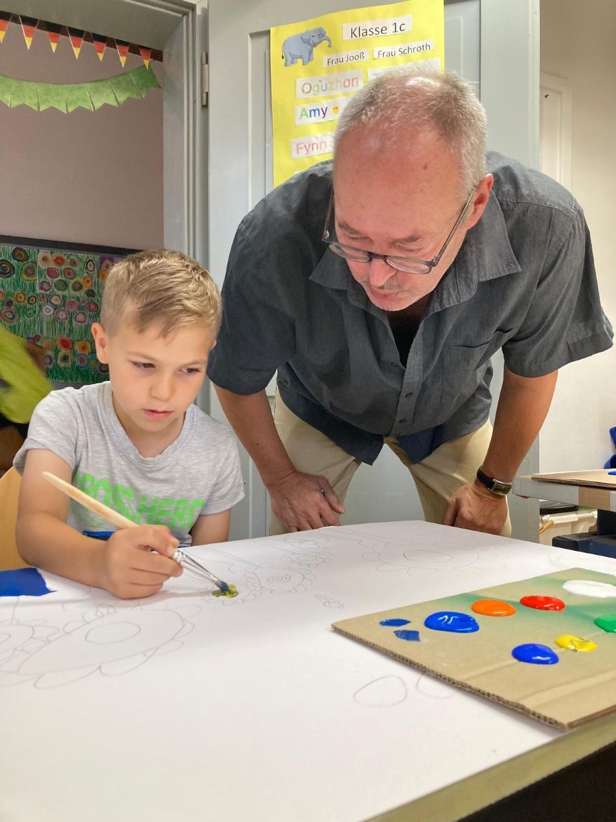 Nach ungefähr zwei Stunden des künstlerischen Schaffens, hatten sich die Erst- und Zweitklässler eine Pause verdient. Doch für Simon Maier ging es gleich weiter. Nun waren die Dritt-bis Sechstklässler an der Reihe. Auch sie hatten die Aufgabe Blumen aus verschiedenen Perspektiven zu malen, was ihnen im Nachhinein betrachtet, wirklich gelang. Interessant zu beobachten war hier, dass die Schüler: innen durch ihre schulische Erfahrung bereits ganz anders an das Thema herangegangen sind und in vereinzelten Bildern sehr viel Tiefe und Kontraste zu erkennen einbauten. Simon Maier, der hier auch sehr häufig von den jungen Künstlern angesprochen wurde, gab einige Tipps und verriet Tricks. Auch hier entstanden viele tolle Bilder, die in einer Abschlussbesprechung gemeinsam mit dem Künstler Herrn Maier betrachtet und besprochen wurden.