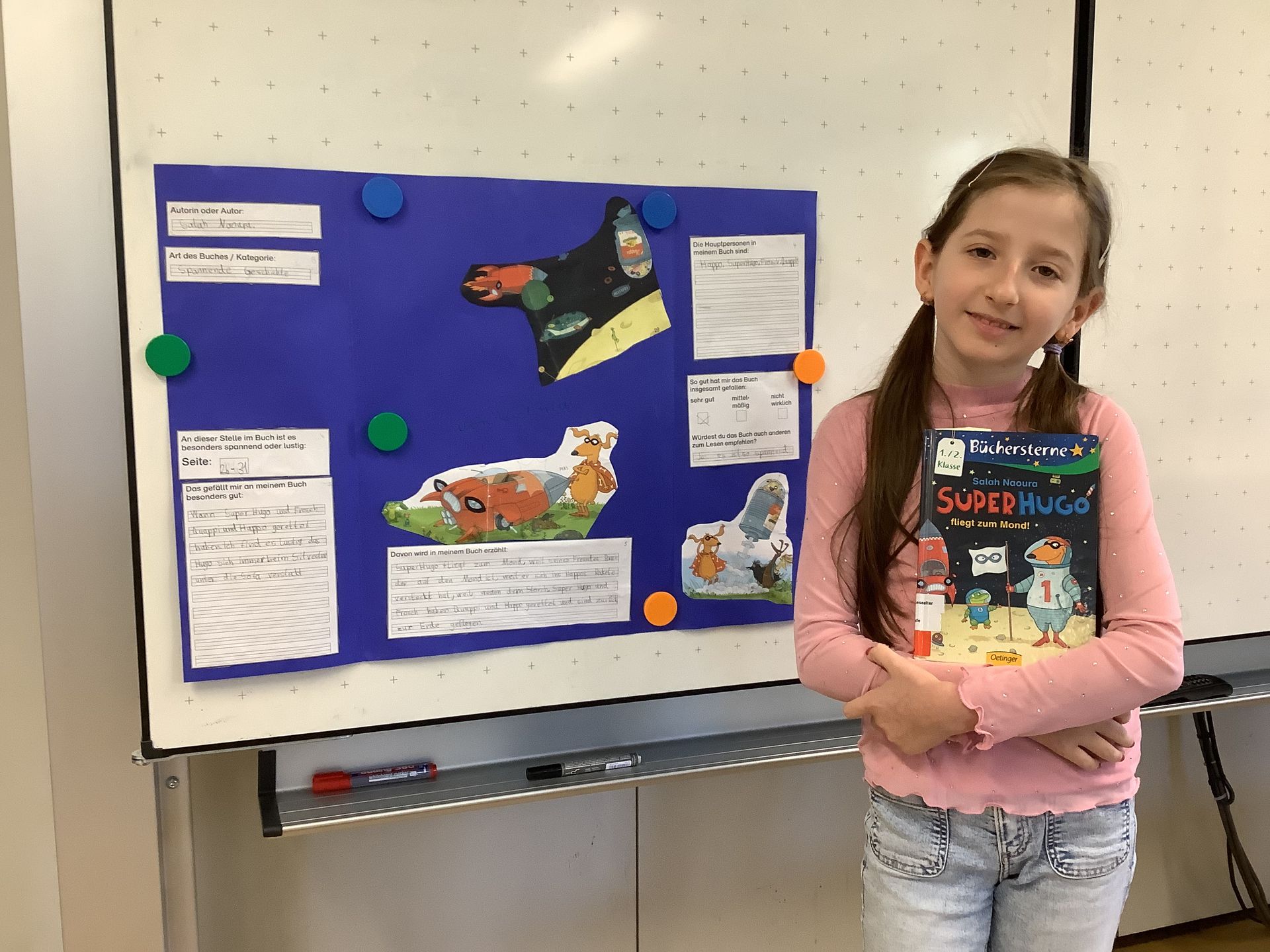 Über die Pfingstferien waren alle Kinder in ihre Bücher vertieft, sodass gleich am ersten Schultag nach den Ferien die Gestaltung der Plakate begonnen werden konnte. Es wurden die Inhalte der Bücher zusammengefasst, Bilder aufgeklebt oder gemalt und das Vorlesen einer Textstelle geübt.