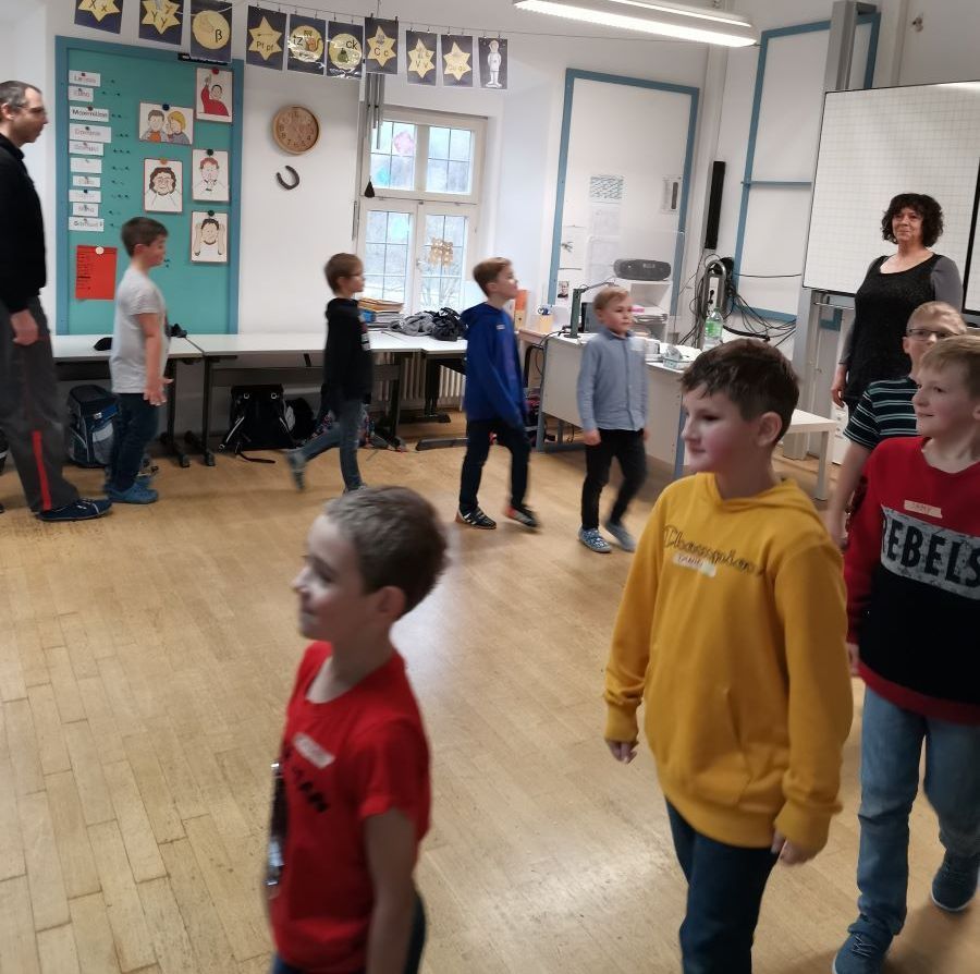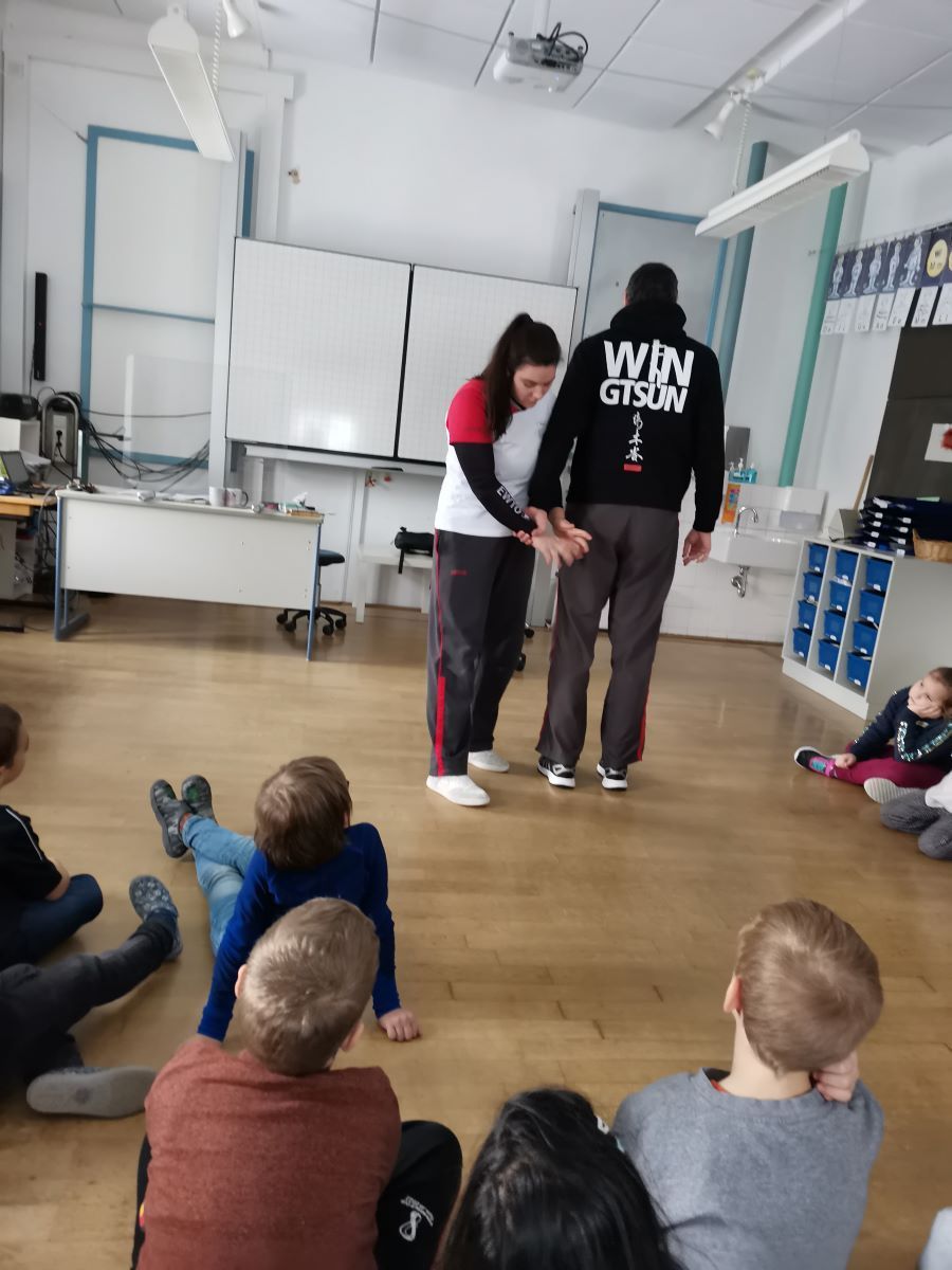 Die zu den Sätzen gehörenden Körperhaltungen übten wir dann miteinander ein. Unser Ziel ist es nämlich, körperliche Angriffe überhaupt zu verhindern, auch auf dem Pausenhof untereinander.