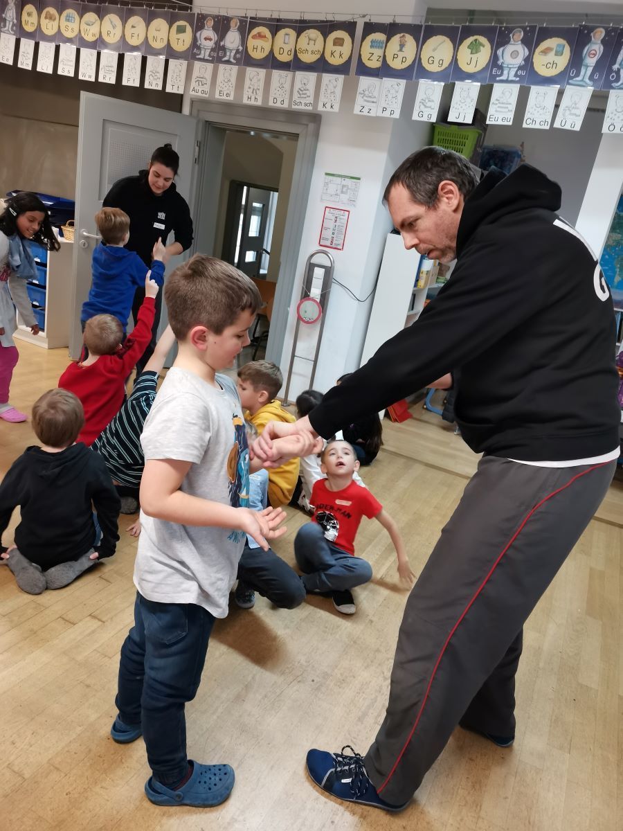 Uns wurden dann noch verschiedene Strategien gezeigt, wie wir uns aus Griffen lösen können. Mit unseren Trainern, die ganz schön stark sind, durften wir sogar messen, wie viel Kraft wir selbst haben, doch wir gegen einen Erwachsenen ohne Schutzstrategien kaum ankommen.